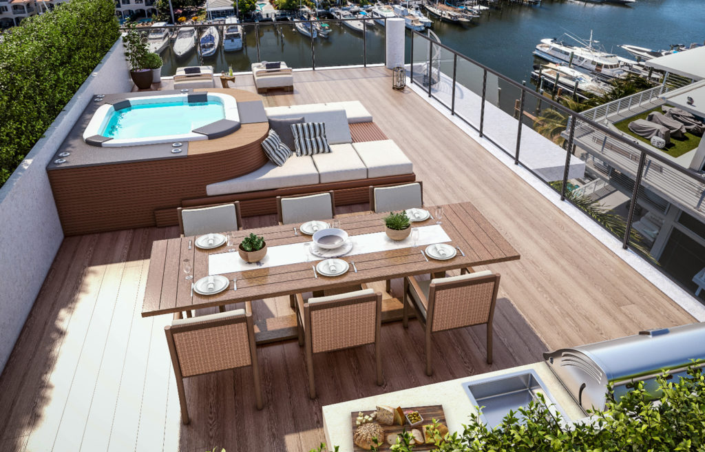 Private rooftop terraces equipped with a hot tub and summer kitchen including 36” wolf grill, ensuring residents can enjoy a spectacular union of indoor-outdoor coastal living.