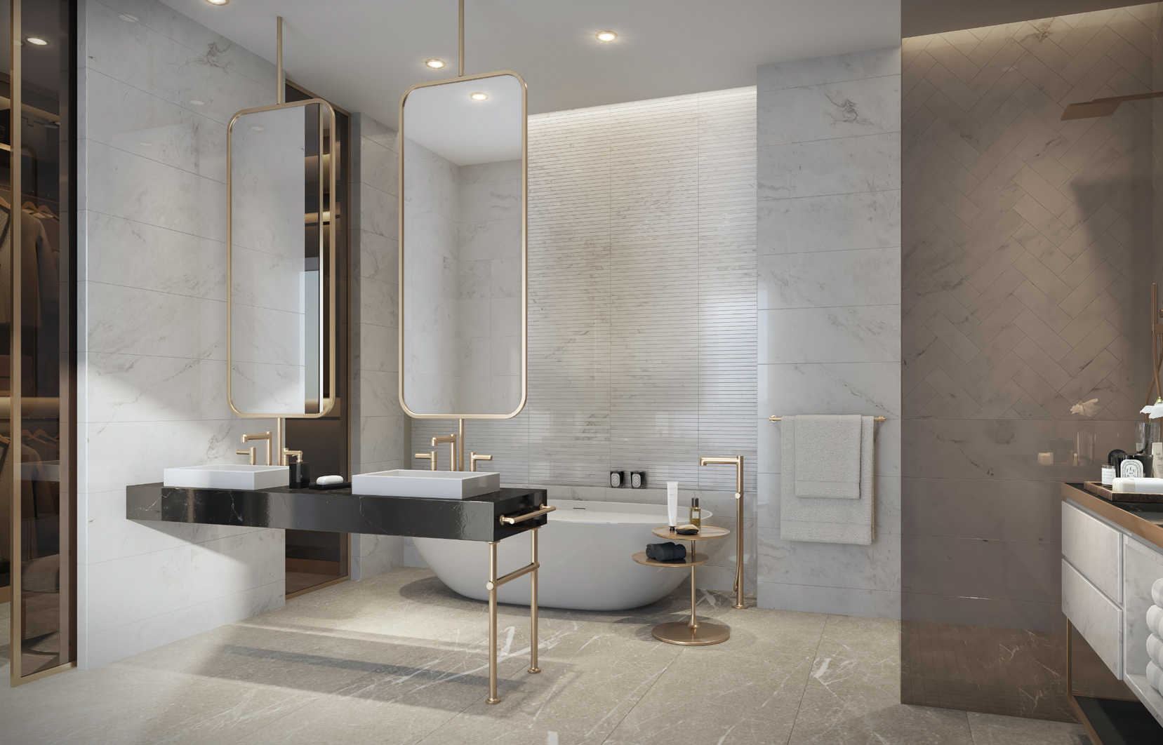 Luxurious master bathroom suites include a contemporary vanity, deep soaking tub, and relaxing rainfall shower, and a spacious walk-in closet (to be built out by buyer).